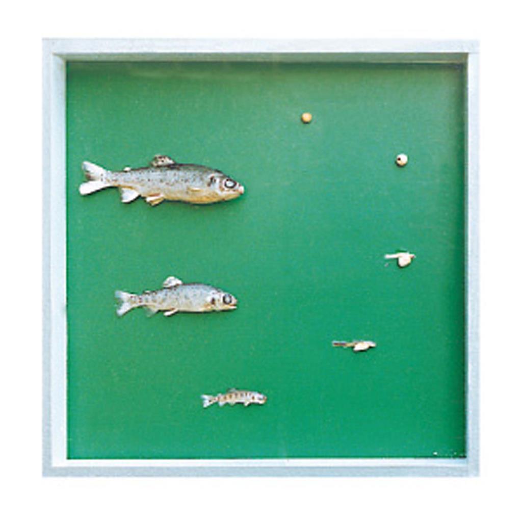 Dieser Objektkasten enthält folgende Naturobjekte: Ei Ei mit Augenfleck des entwickelnden Embryos geschlüpfte Forelle mit großem Dottersack kleine Forelle mit schwindendem Dottersack 3 Jungforellen