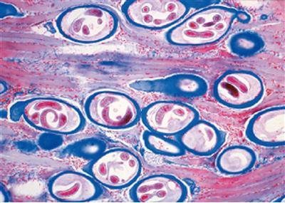 1. Strudelwurm, total 2. Strudelwurm, quer 3. Leberegel, total 4. Leberegel, quer 5. Bandwurm, Proglottiden, total 6. Bandwurm sp., reife Proglottiden 7. Bandwurm sp., Kopf 8. Echinococcus multilocularis, infizierte Leber, quer 9. Madenwurm 10. Trichinen verkapselt im Muskel, längs 11.