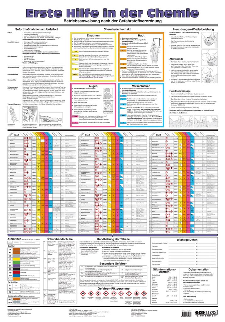 Wandtafel 70 x 100 cm - So leisten Sie Erste Hilfe bei Chemikalienunfällen! In der zentralen Tabelle sehen Sie für 97 gängige Chemikalien schnell, wie Sie mögliche Gesundheitsschäden vermeiden oder reduzieren - bei Kontakt durch Einatmen oder Verschlucken sowie bei Haut- oder Augenkontakt. Inklusive